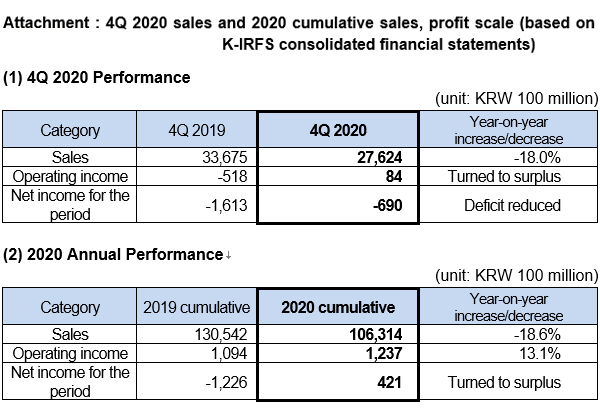 While major influences that affected 4Q 2020 were COVID-19 and off-season, operating income and net income losses for the period due to one-time factors including valuation losses for closed-down overseas businesses incurred from selling off Australian Resources Corporation and impairment of deferred income tax assets. However, these losses eliminated the possibility for potentially increasing losses in the future; thus, providing a solid foundation on which sustained growth and stakeholder (e.g. shareholders) value enhancement can be achieved.