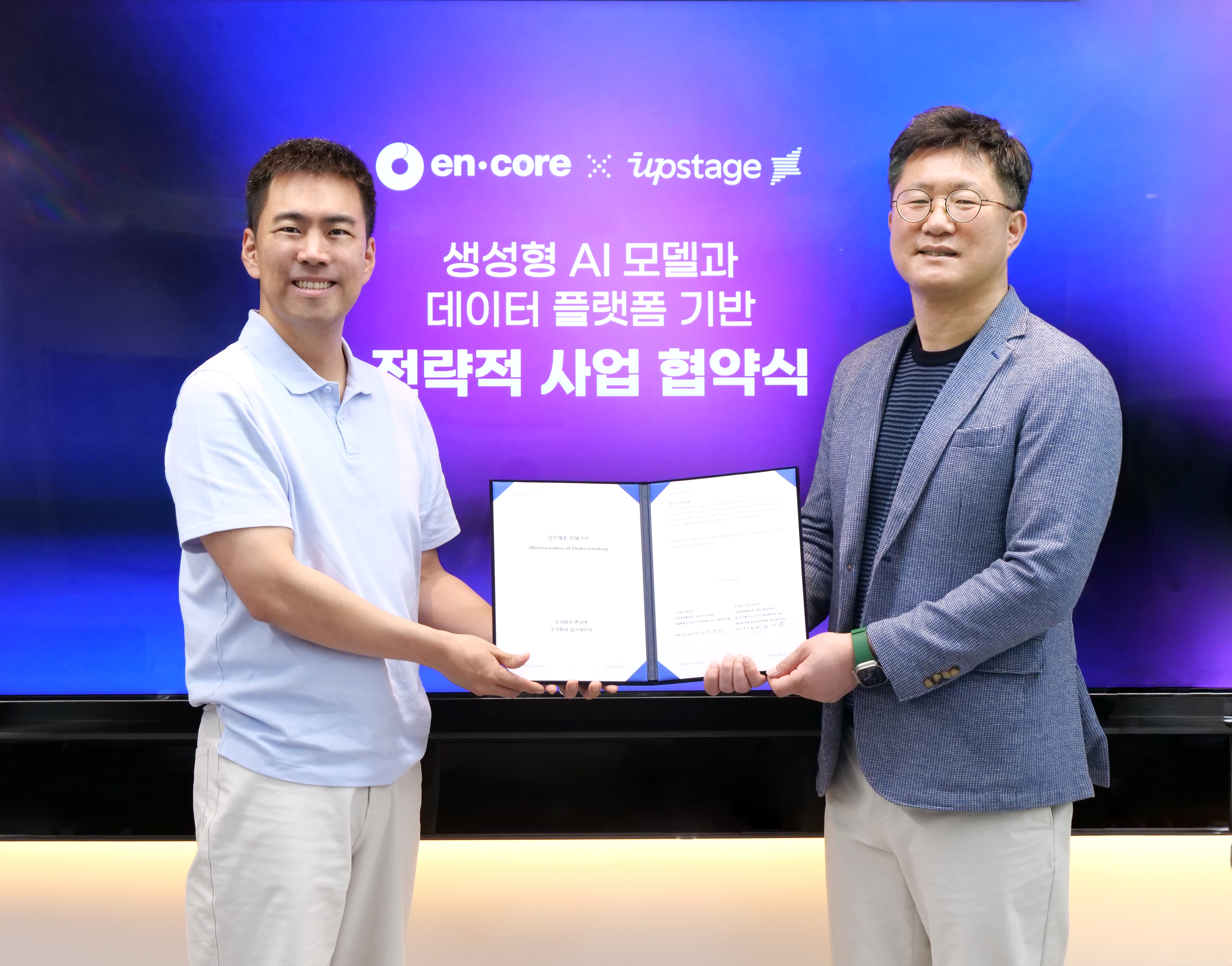 [사진 1 : 우측 엔코아 김주민 대표, 좌측 업스테이지 권순일 부사장]