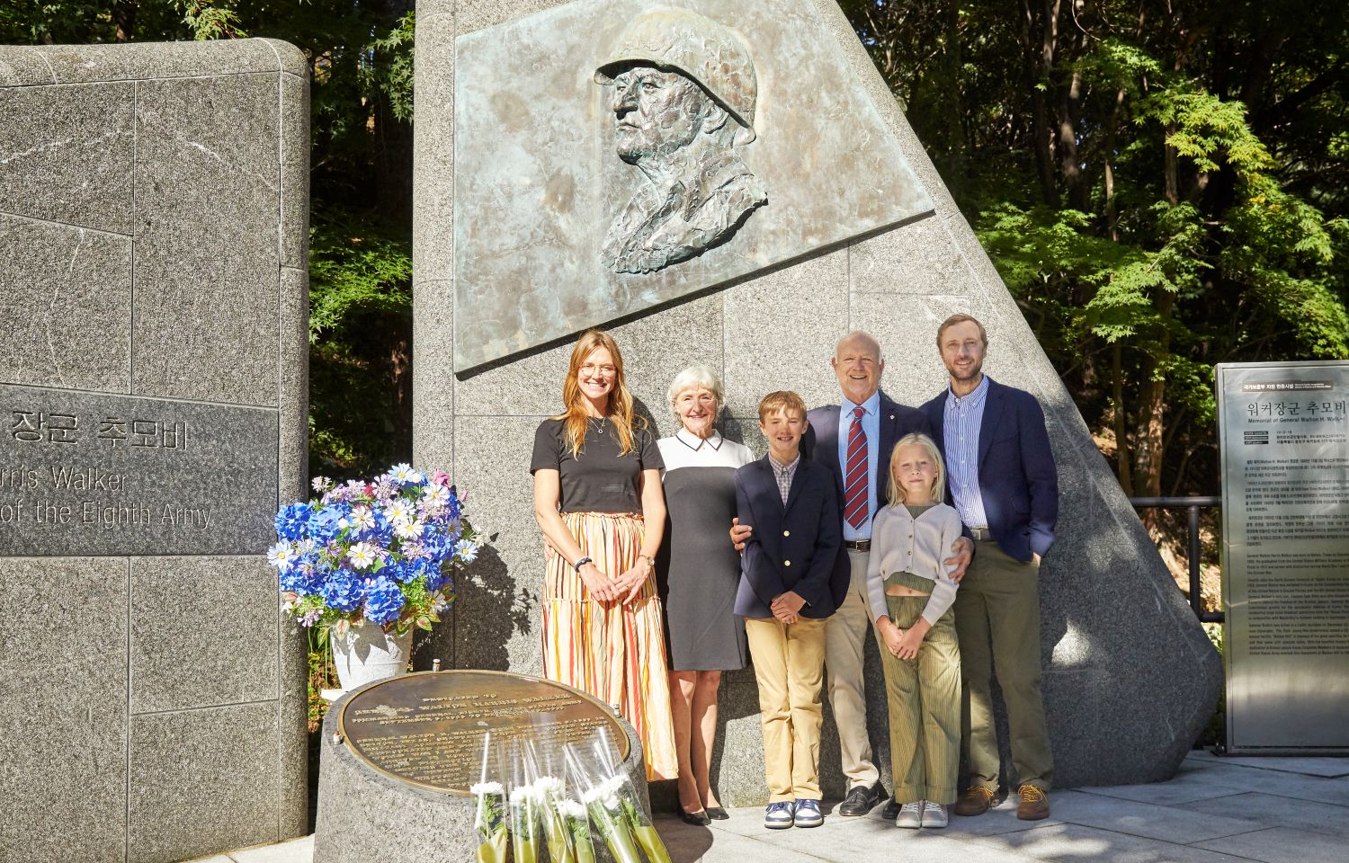 워커 장군의 손자 샘 워커 2세 부부와 딸 샬롯 올슨 가족이 워커힐 호텔 내 위치한 워커 장군 추모비에서 헌화 및 추모 후 기념촬영을 하고 있다. = 워커힐 호텔앤리조트 제공